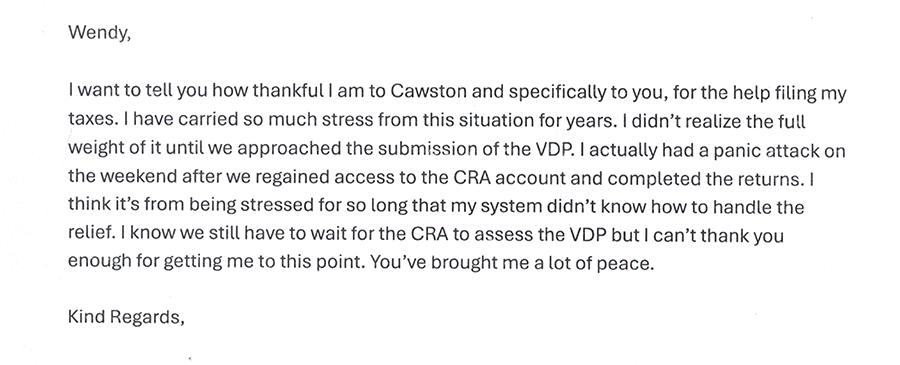 After 10 plus years of not paying income tax, due to a snowball effect of one life event after another, I could no longer take the stress of looking over my shoulder wondering if and when the CRA would finally “get me”. For years I wanted to come clean but my fear of the CRA and my lack of knowledge as to how to even approach them, held me back. I feared going to jail. Then I was lucky enough to stumble across Cawston and Associates. Not only are they very knowledgeable in everything to do with the CRA and situations like mine, they are also really great people. They were not judgmental and they protected me like I was a member of their family. At no point did I have to deal with the CRA personally. Cawston handled everything for me and explained every option and outcome in detail.