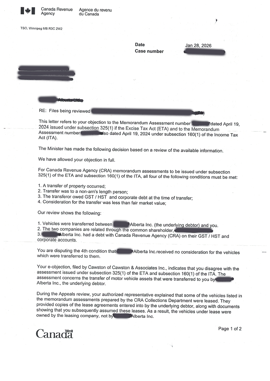 March 26, 2026 Update: A letter from the CRA giving our client a favorable appeal